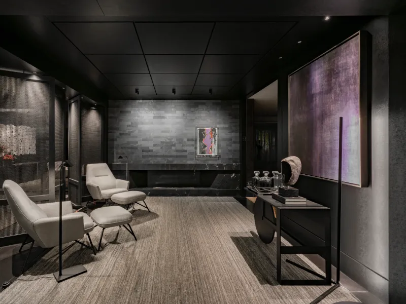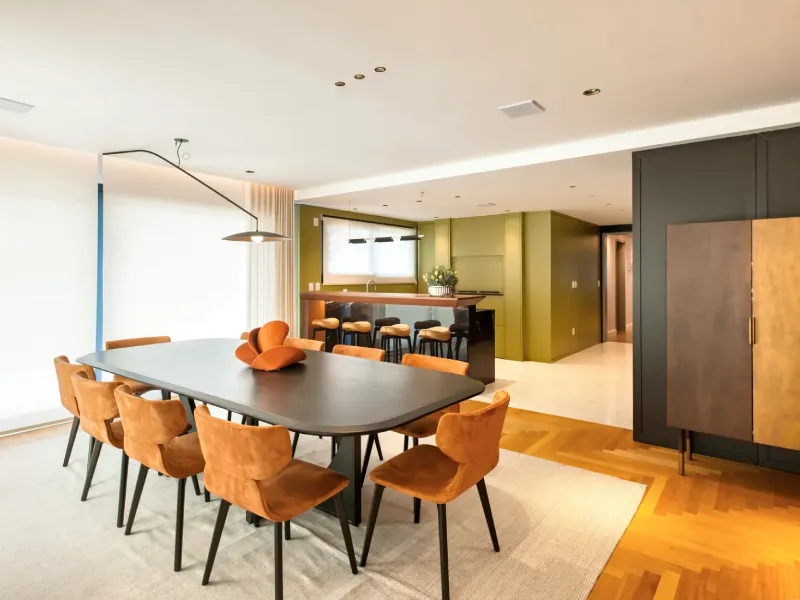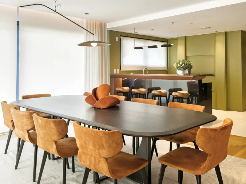O ambiente assinado pelo arquiteto Rogério Menin apresenta uma proposta contemporânea que valoriza a integração entre design, materiais e iluminação.