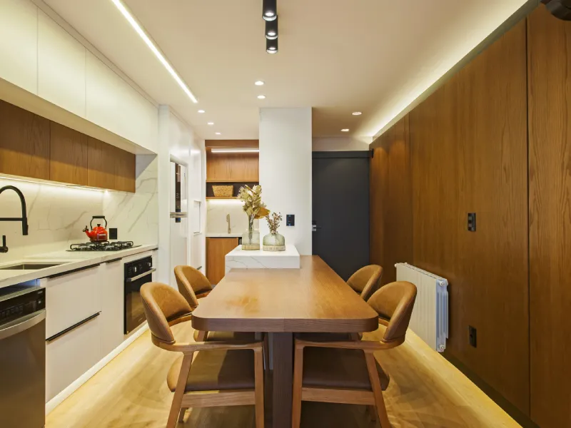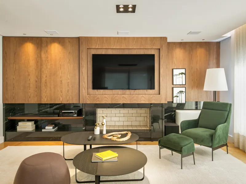 O ambiente assinado pela arquiteta Carolina Castillo valoriza a integração dos espaços, com soluções de marcenaria pensadas para organização, conforto e elegância.