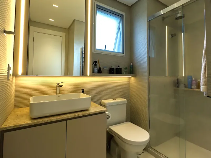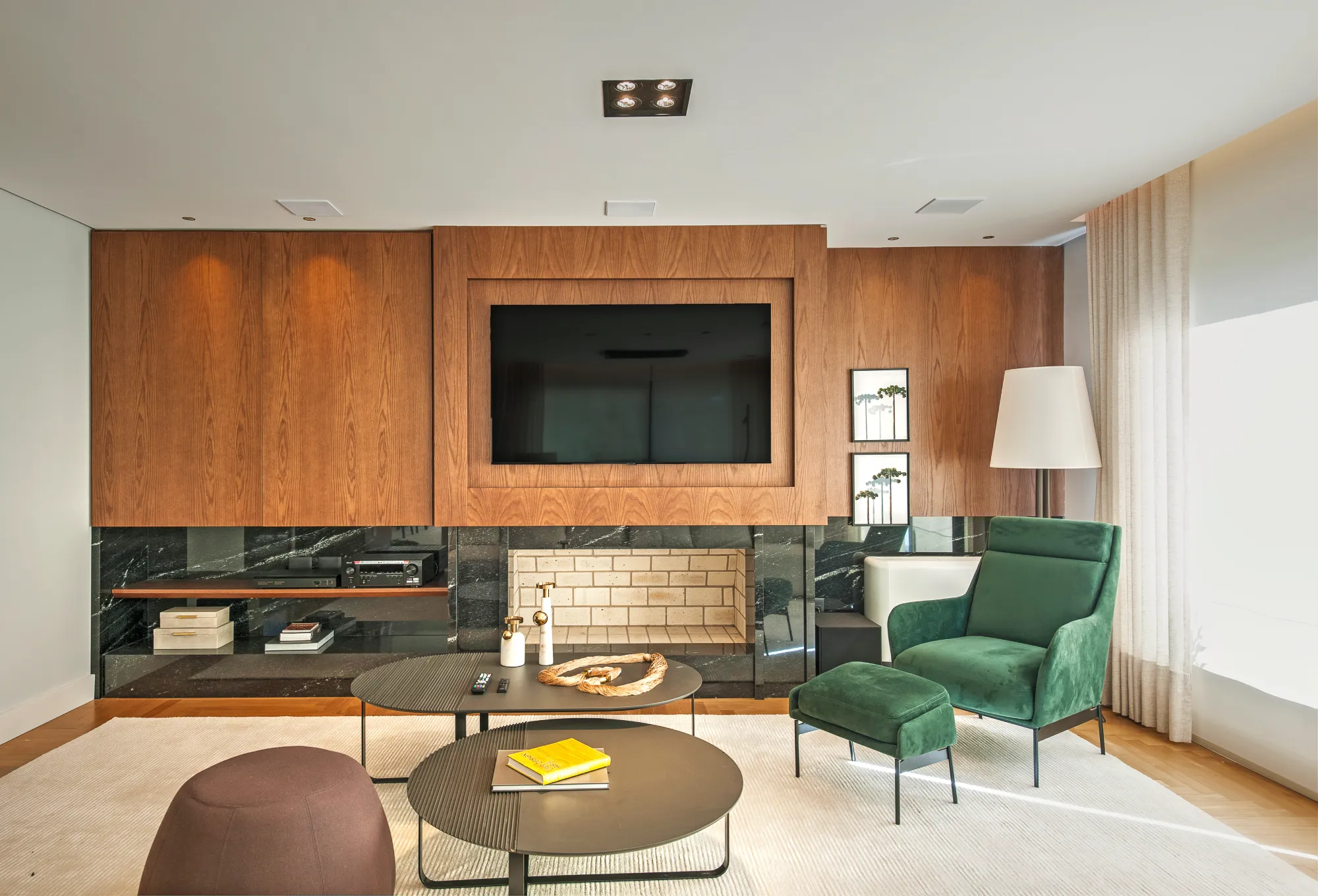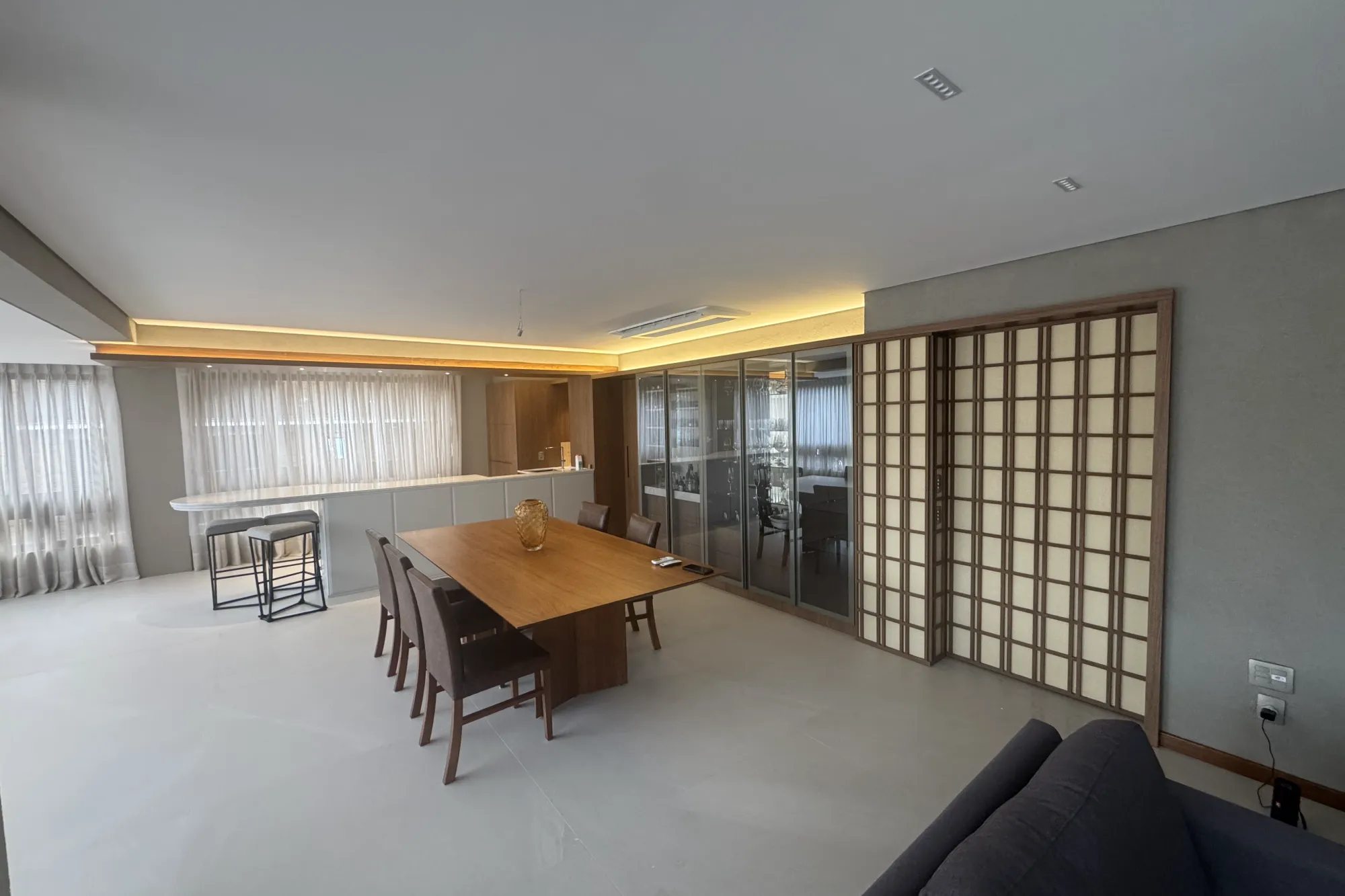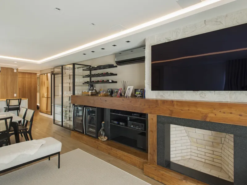 O ambiente assinado pelo arquiteto Rogério Menin apresenta uma proposta contemporânea que valoriza a integração entre design, materiais e iluminação.