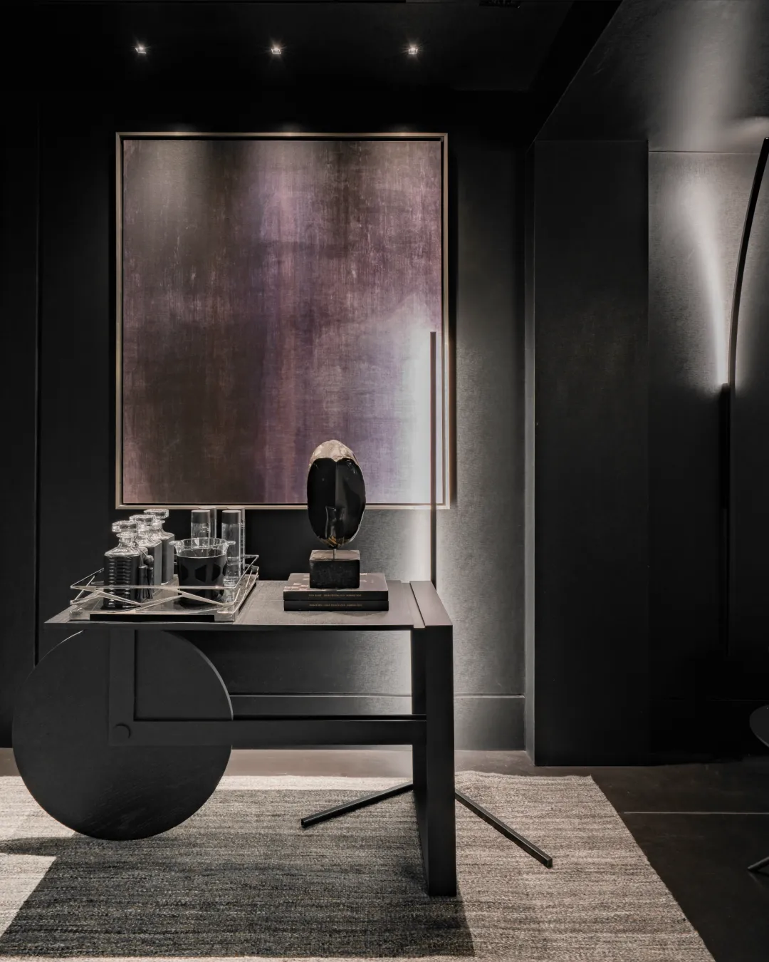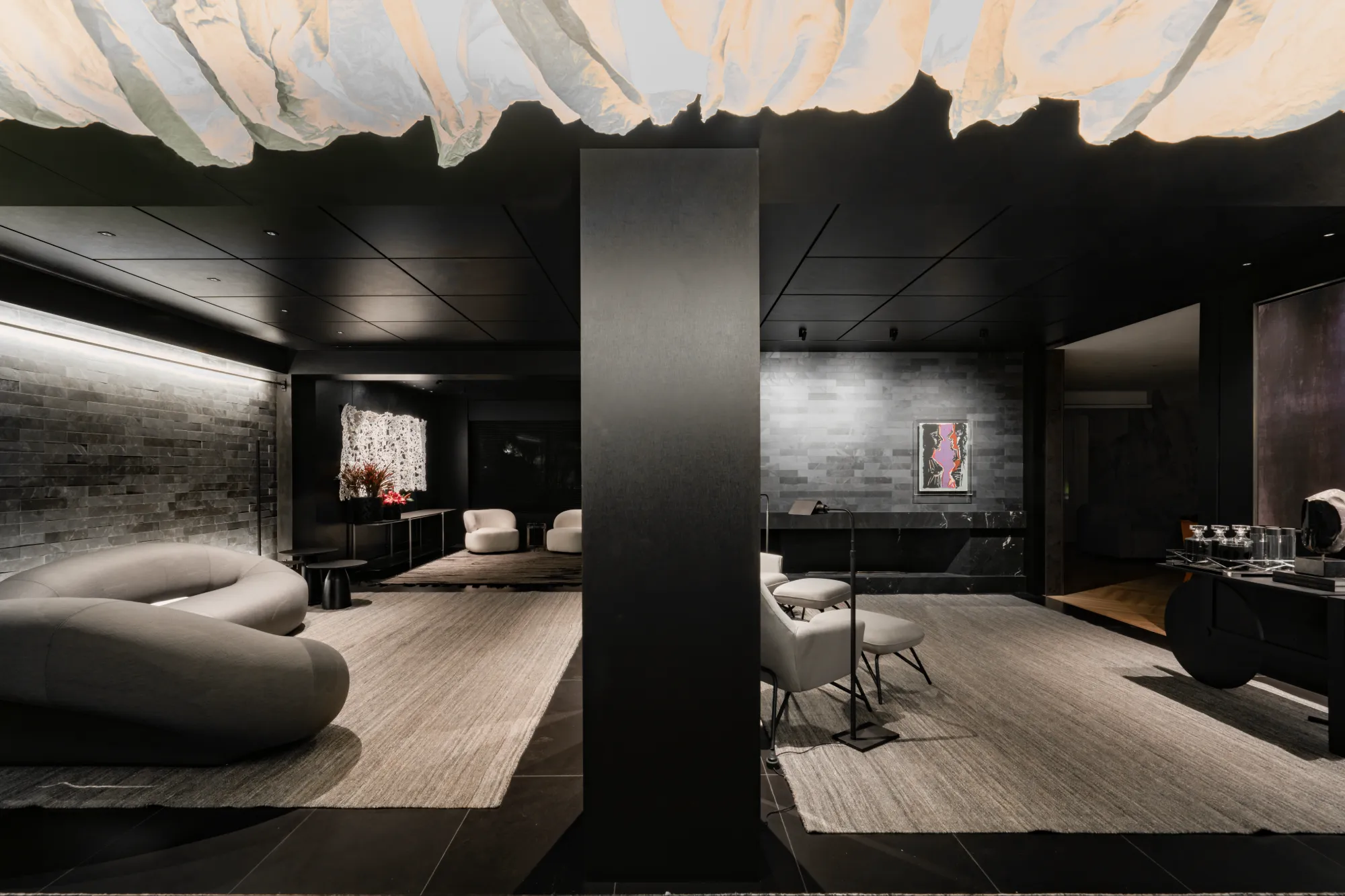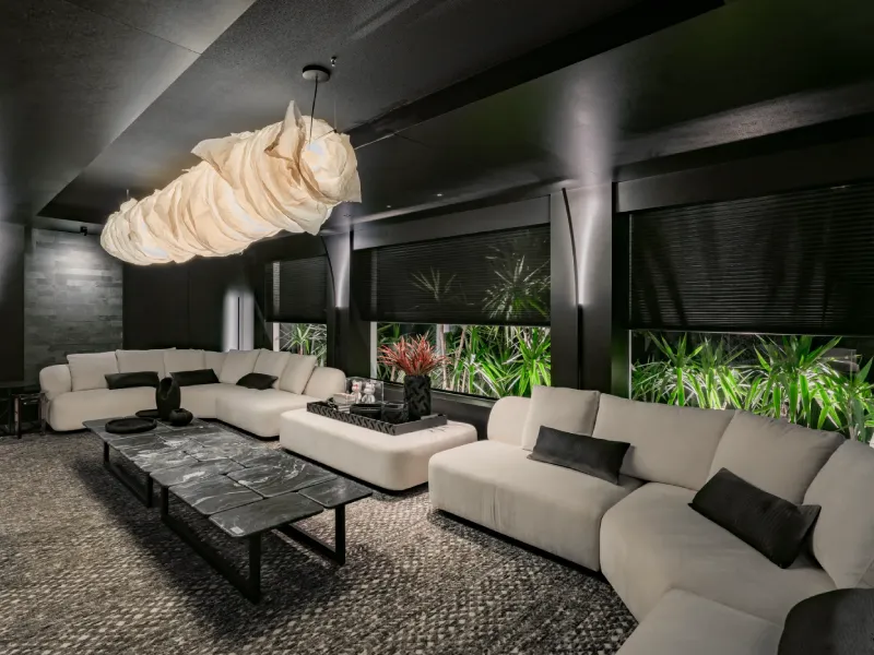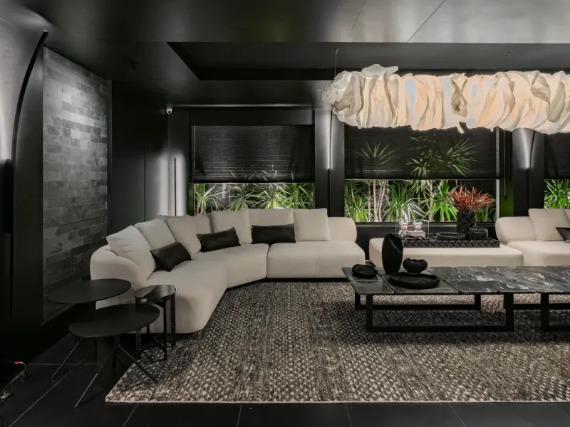 O ambiente assinado pelo arquiteto Rogério Menin apresenta uma proposta contemporânea que valoriza a integração entre design, materiais e iluminação.