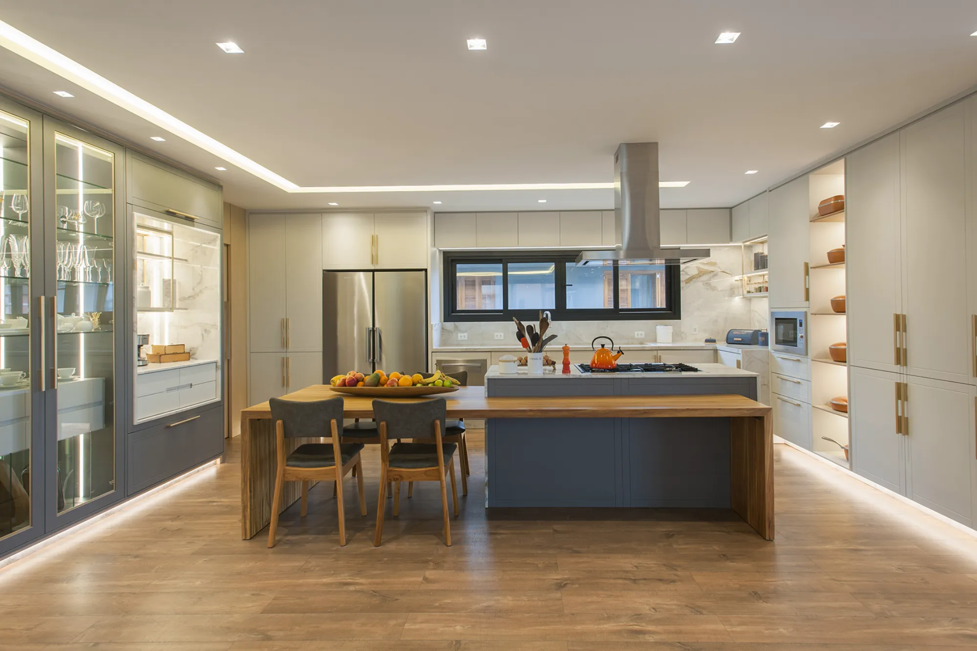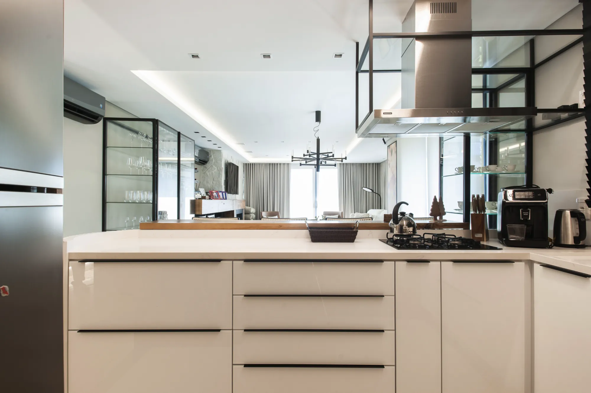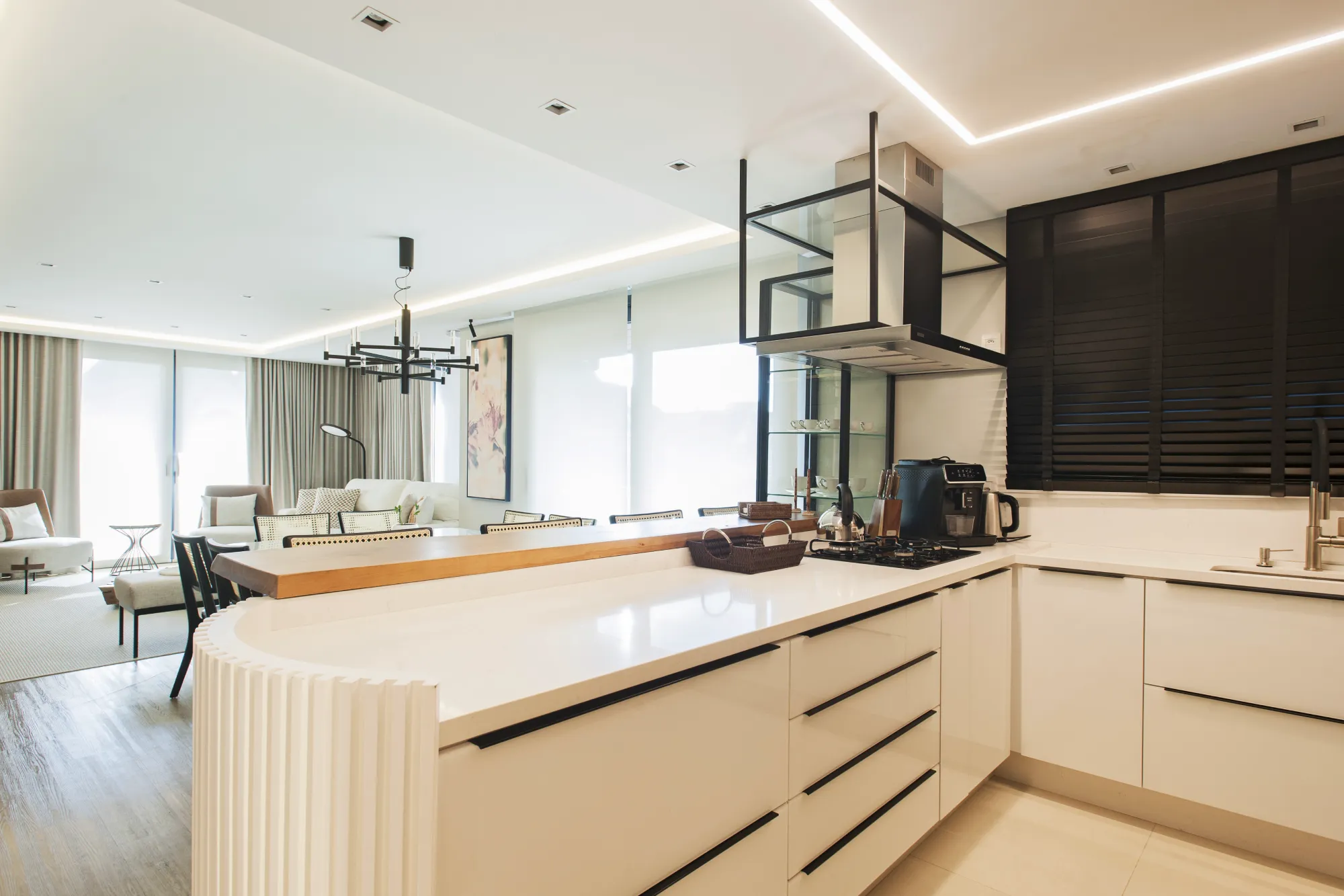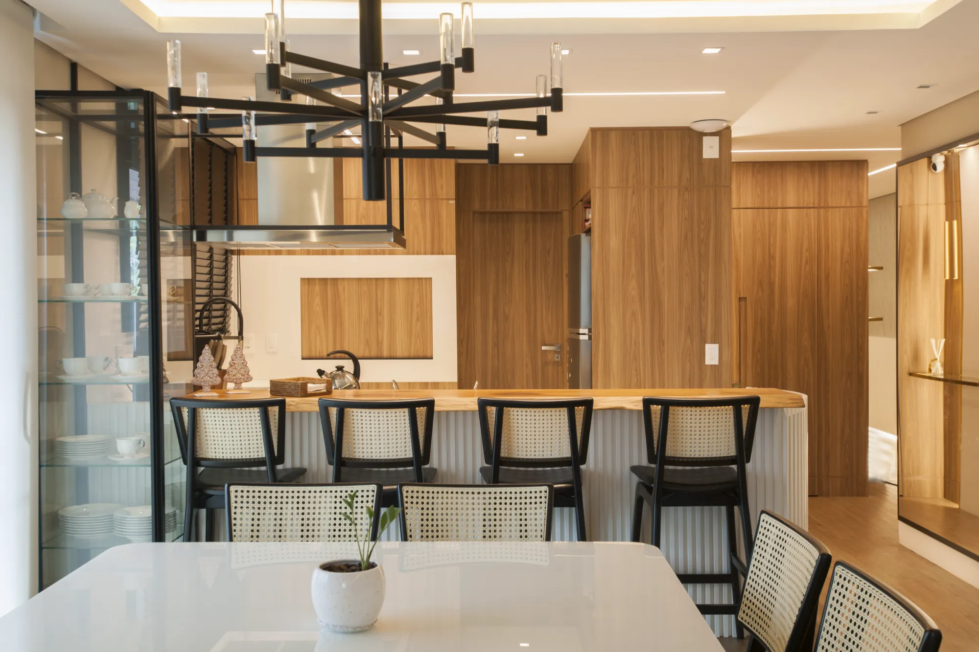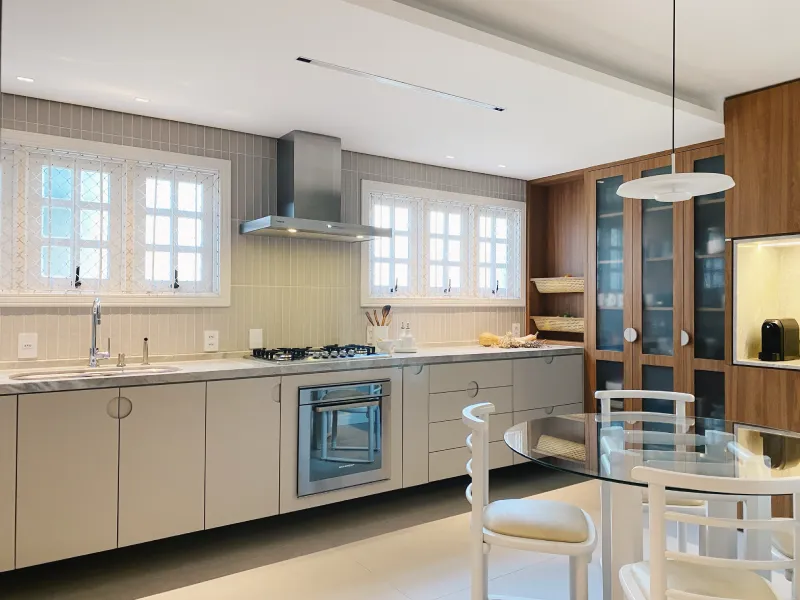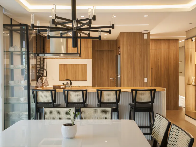 O ambiente assinado pela arquiteta Camila Neves valoriza a integração dos espaços, com soluções de marcenaria pensadas para funcionalidade, elegância e conforto no dia a dia.