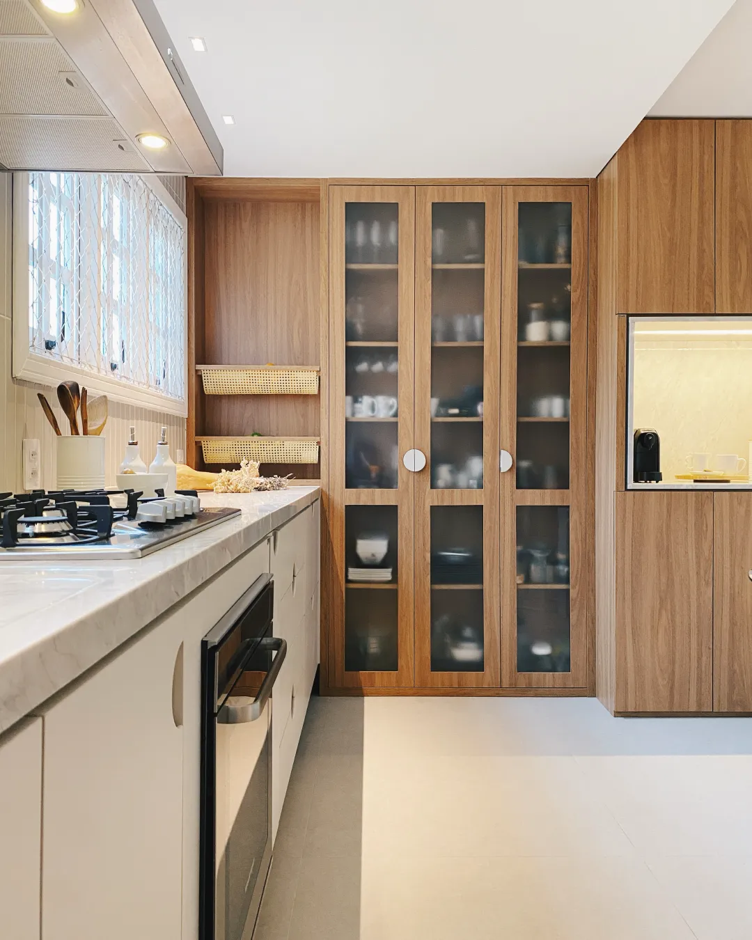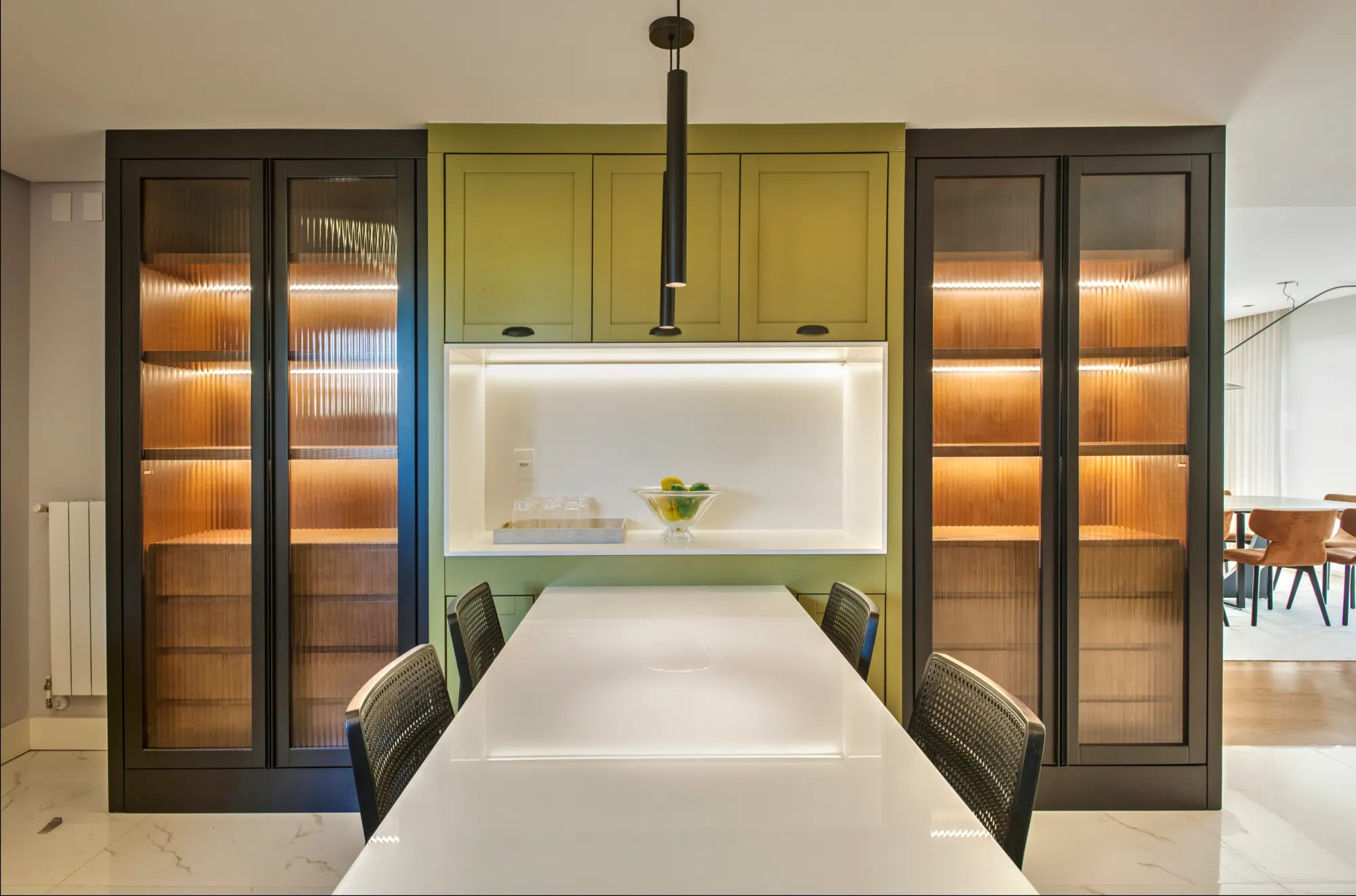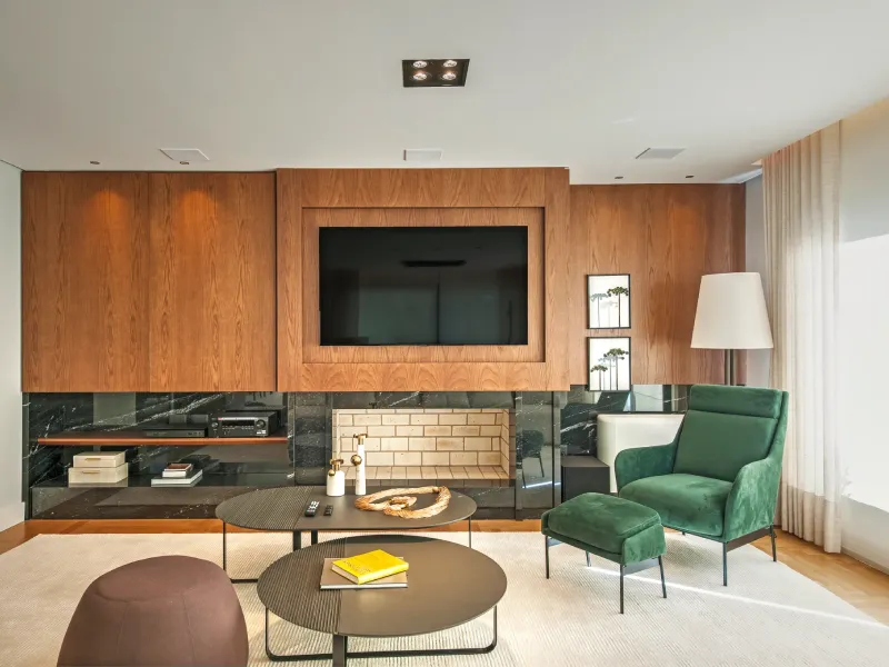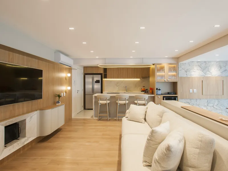 O ambiente assinado pela arquiteta Carolina Castillo valoriza a integração dos espaços, com soluções de marcenaria pensadas para organização, conforto e elegância.