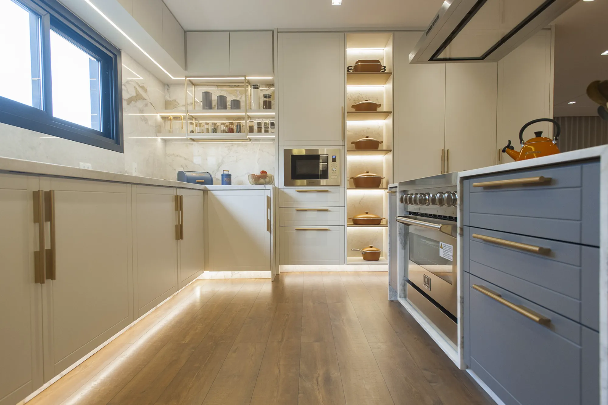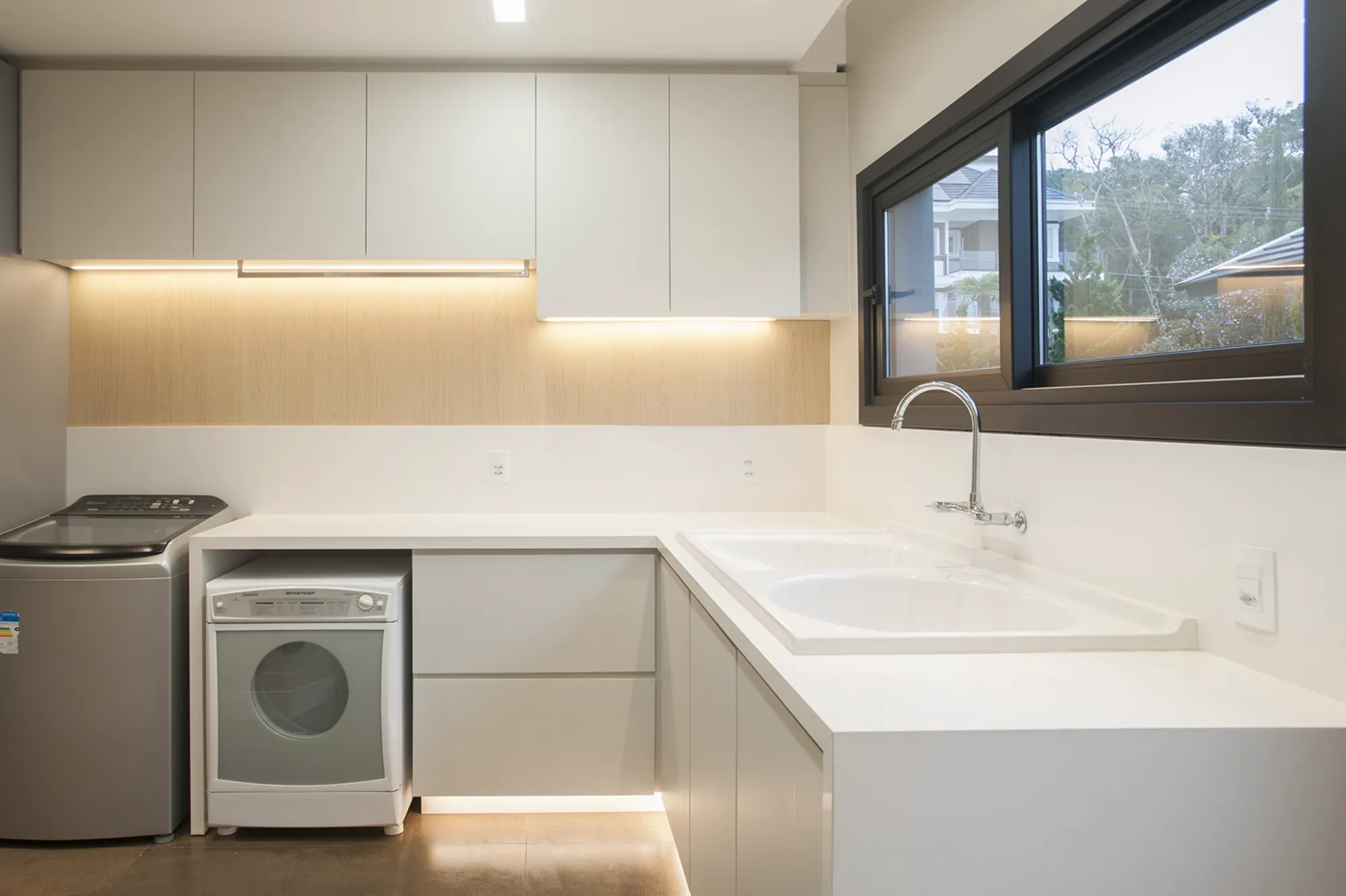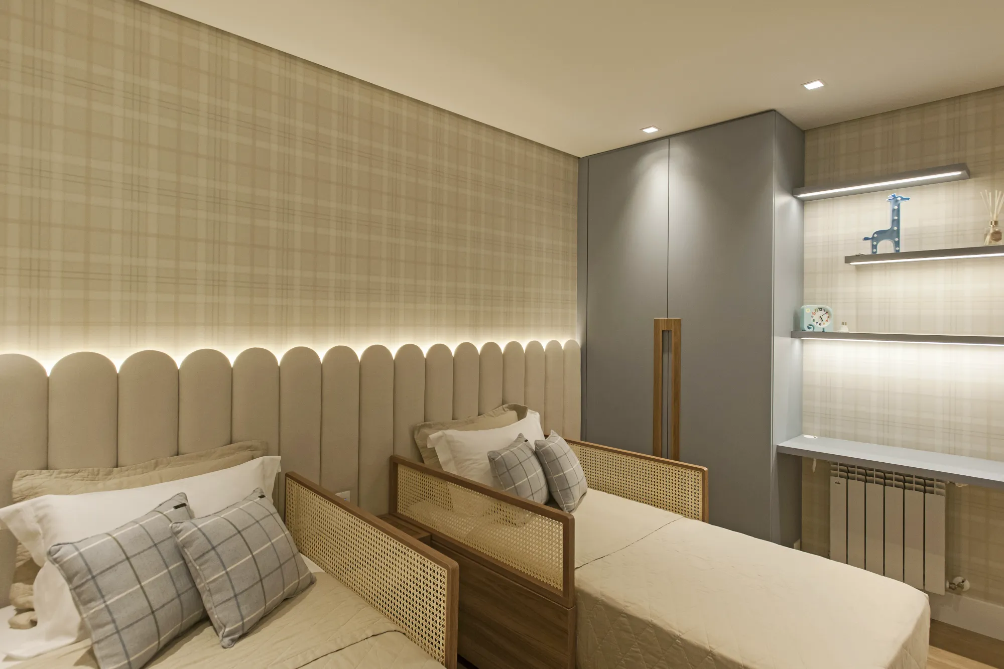 O ambiente assinado pela arquiteta Carolina Castillo valoriza a integração dos espaços, com soluções de marcenaria pensadas para organização, conforto e elegância.